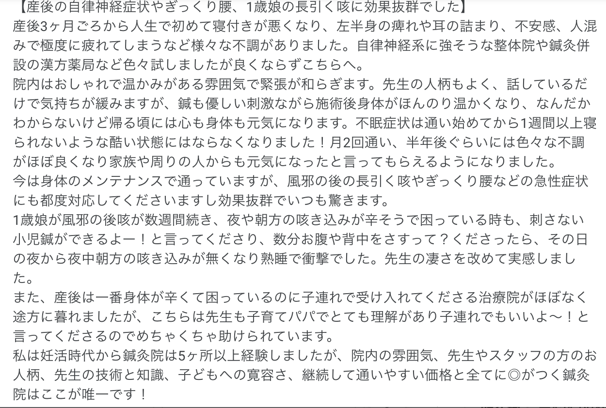 また、産後は一番身体が辛くて困っているのに子連れで受け入れてくださる治療院がほぼなく途方に暮れましたが、こちらは先生も子育てパパでとても理解があり子連れでもいいよ〜!と言ってくださるのでめちゃくちゃ助けられています。