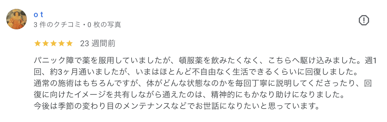 パニック障で薬を服用していましたが、頓服薬を飲みたくなく、こちらへ駆け込みました。