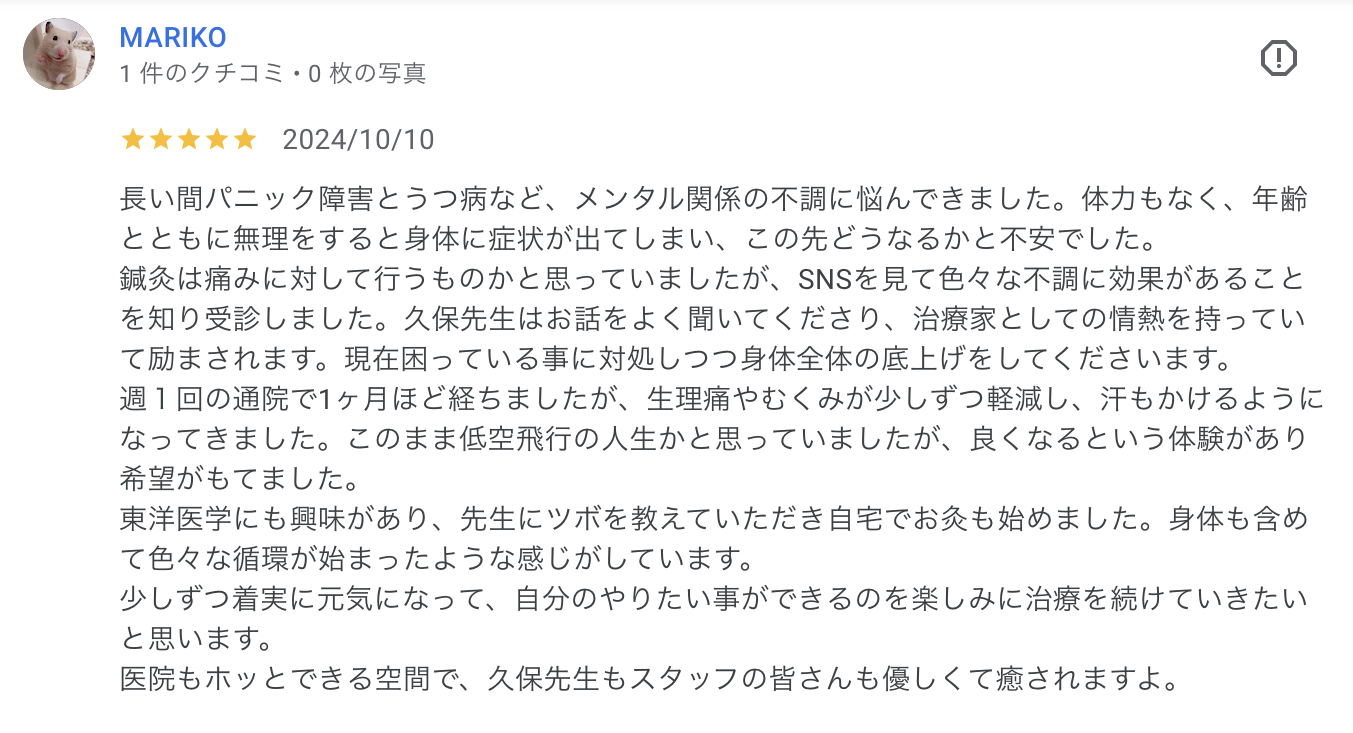鍼灸は痛みに対して行うものかと思っていましたが、SNSを見て色々な不調に効果があることを知り受診しました。久保先生はお話をよく聞いてくださり、治療家としての情熱を持っていて励まされます。
