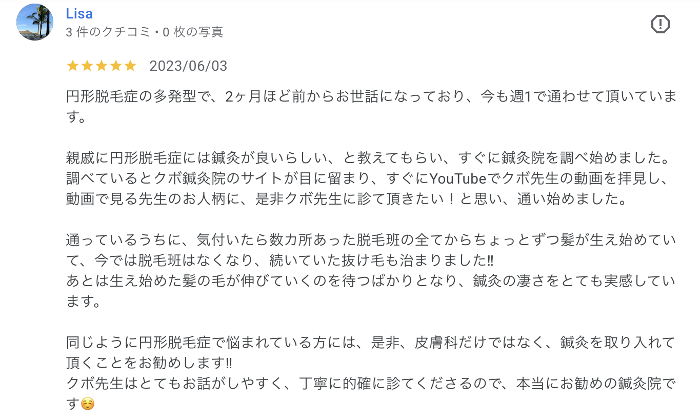 同じように円形脱毛症で悩まれている方には、是非、皮膚科だけではなく、鍼灸を取り入れて頂くことをお勧めします‼︎