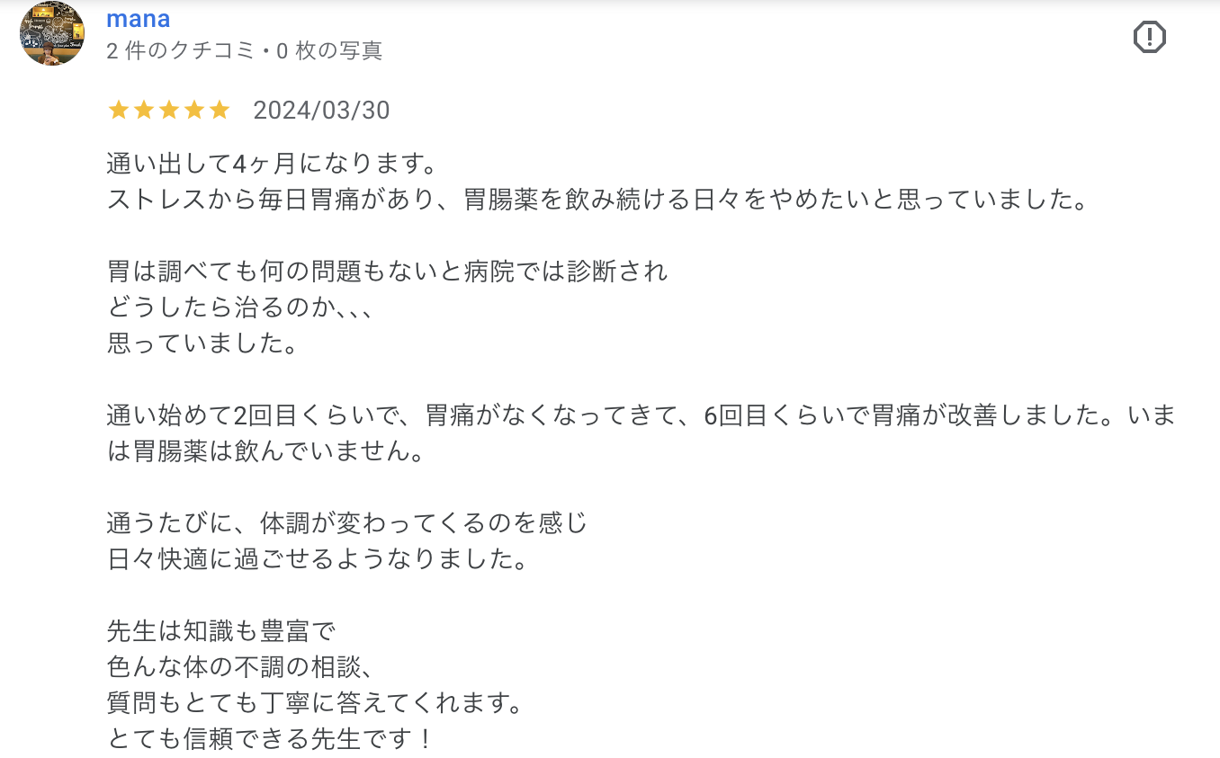 通い始めて2回目くらいで、胃痛がなくなってきて、6回目くらいで胃痛が改善しました。いまは胃腸薬は飲んでいません。