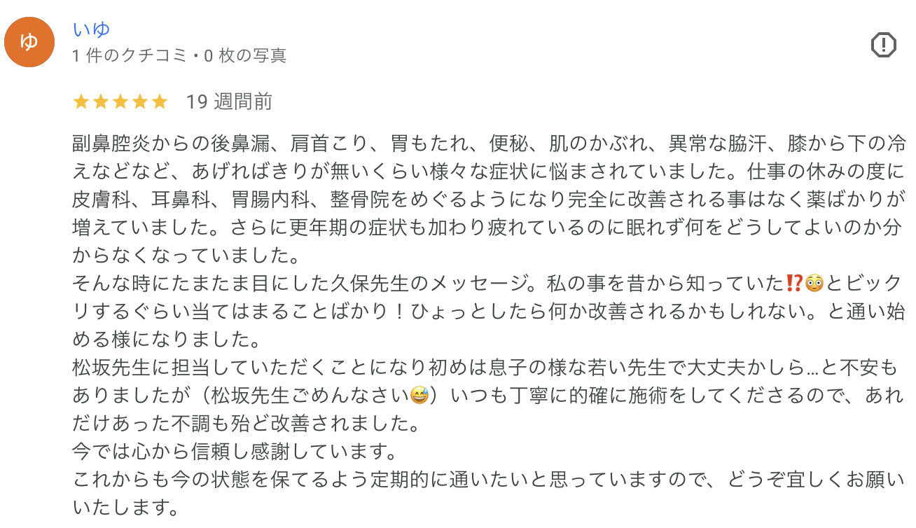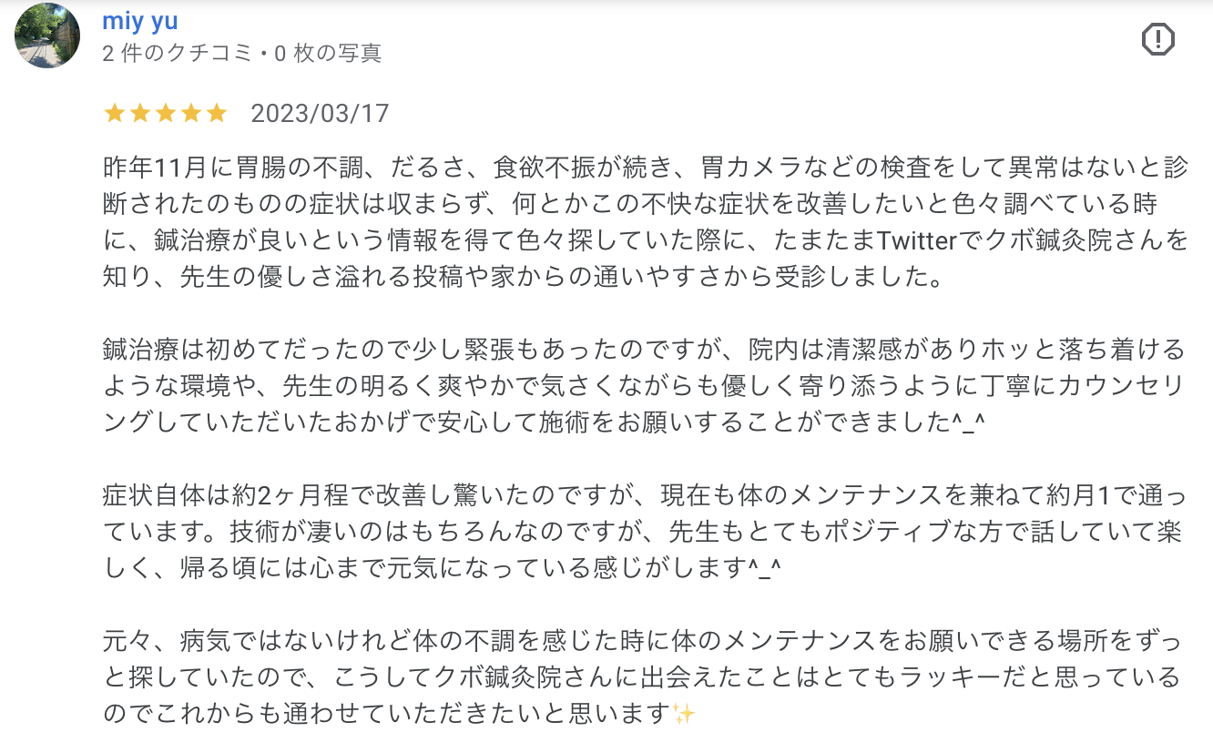 昨年11月に胃腸の不調、だるさ、食欲不振が続き、胃カメラなどの検査をして異常はないと診断されたのものの症状は収まらず、何とかこの不快な症状を改善したいと色々調べている時に、鍼治療が良いという情報を得て色々探していた際に、たまたまTwitterでクボ鍼灸院さんを知り、先生の優しさ溢れる投稿や家からの通いやすさから受診しました。
