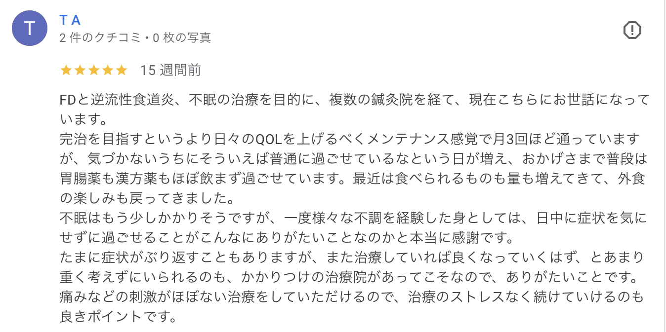FDと逆流性食道炎、不眠の治療を目的に、複数の鍼灸院を経て、現在こちらにお世話になっています。