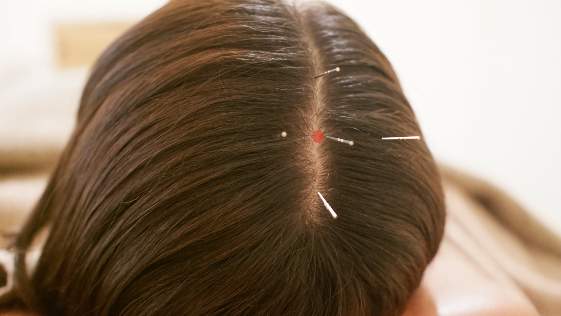 場所:頭のてっぺん。左右の耳の最高部を結んだ線と、顔の中心線が交わるところ。