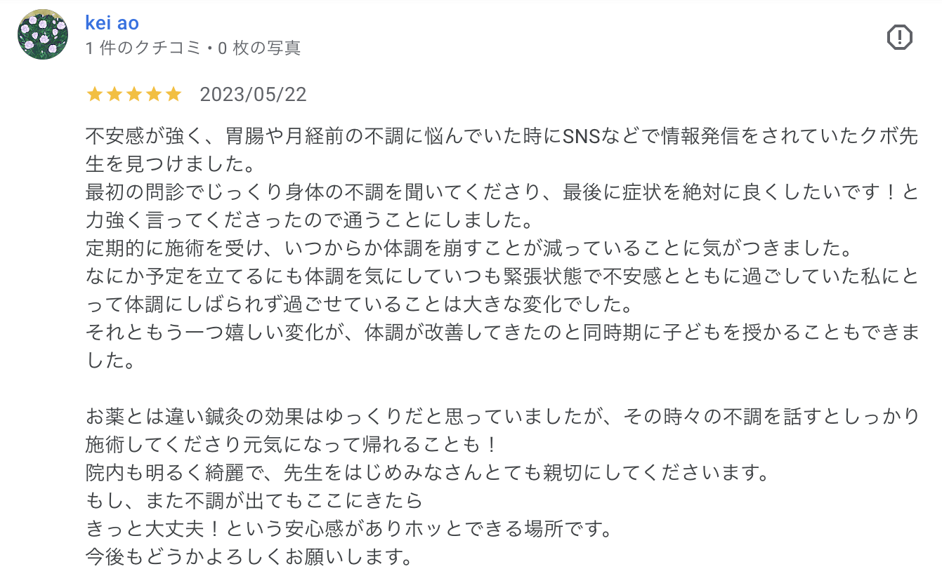 不安感が強く、胃腸や月経前の不調に悩んでいた時にSNSなどで情報発信をされていたクボ先生を見つけました。