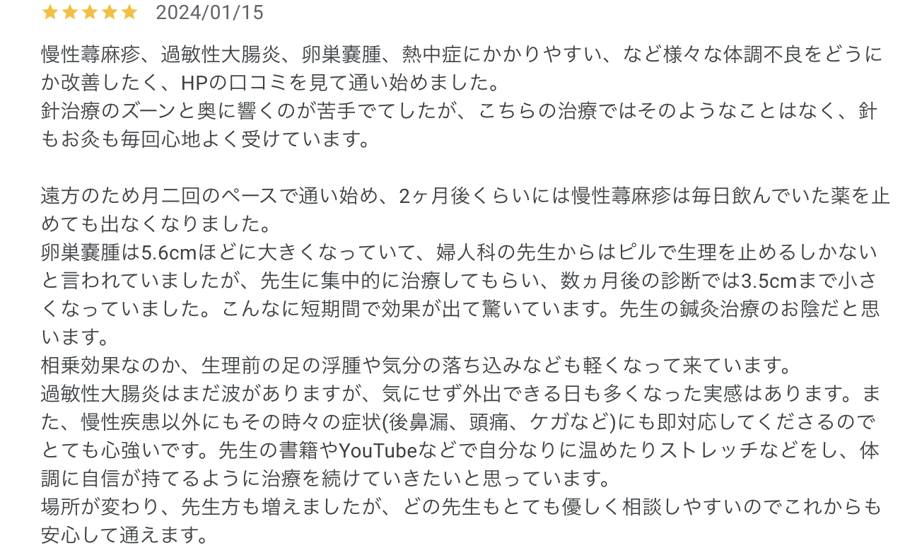 慢性蕁麻疹、過敏性大腸炎、卵巣嚢腫、熱中症にかかりやすい、など様々な体調不良をどうにか改善したく、HPの口コミを見て通い始めました。