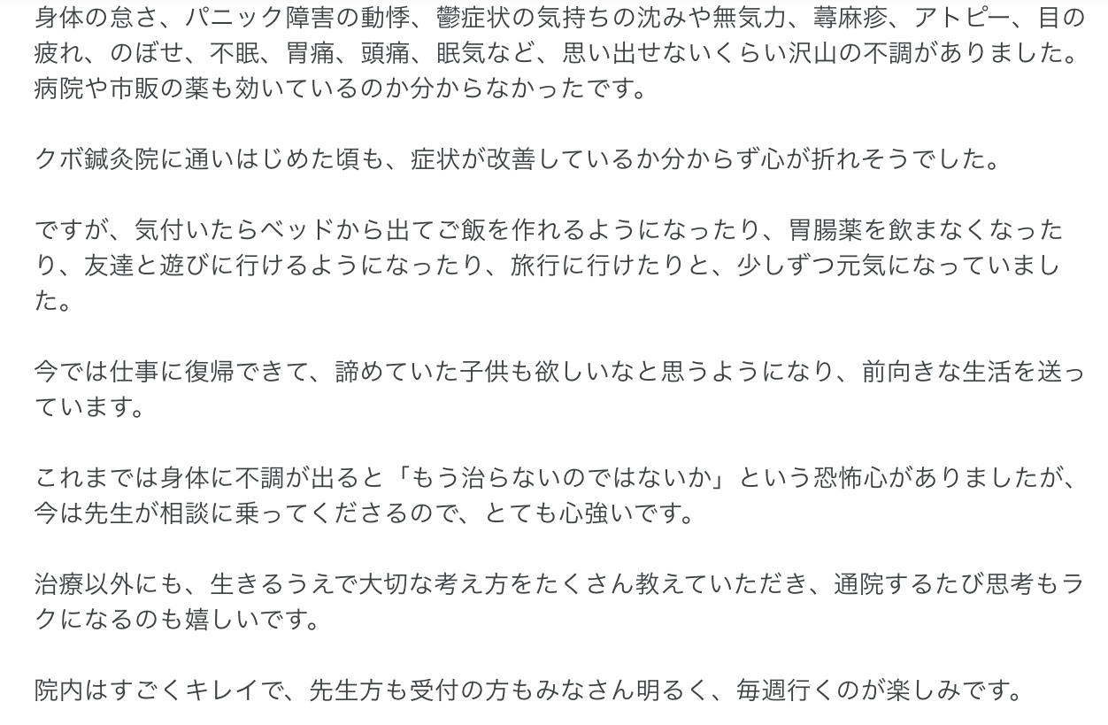 どこの鍼灸がよいのか、と考えた際、不調が気になってからお世話になっていた漢方の先生のお勧めでクボ鍼灸院に伺いました。