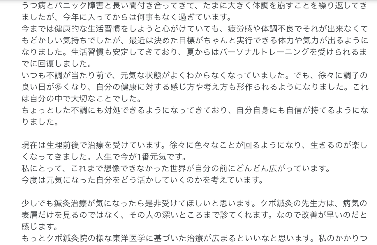 クボ鍼灸院に出会えていなかったら、私はまだ暗闇にいました。出会えてよかったです。ありがとうございます。これからもよろしくお願いします。