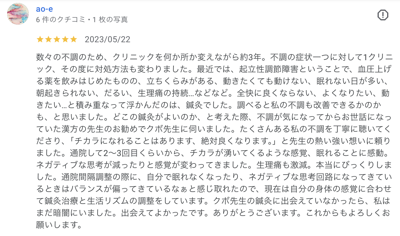 なので改善が早いのだと感じます。もっとクボ鍼灸院の様な東洋医学に基づいた治療が広まるといいなと思います。