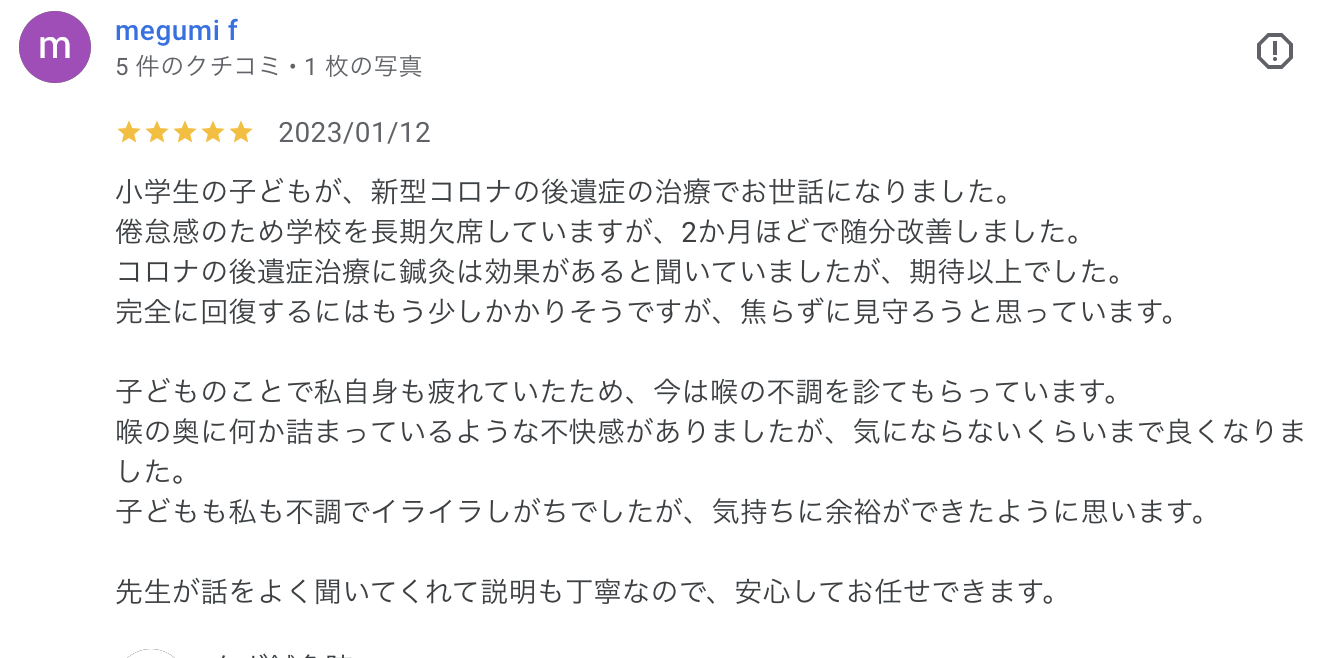 コロナの後遺症治療に鍼灸は効果があると聞いていましたが、期待以上でした。
