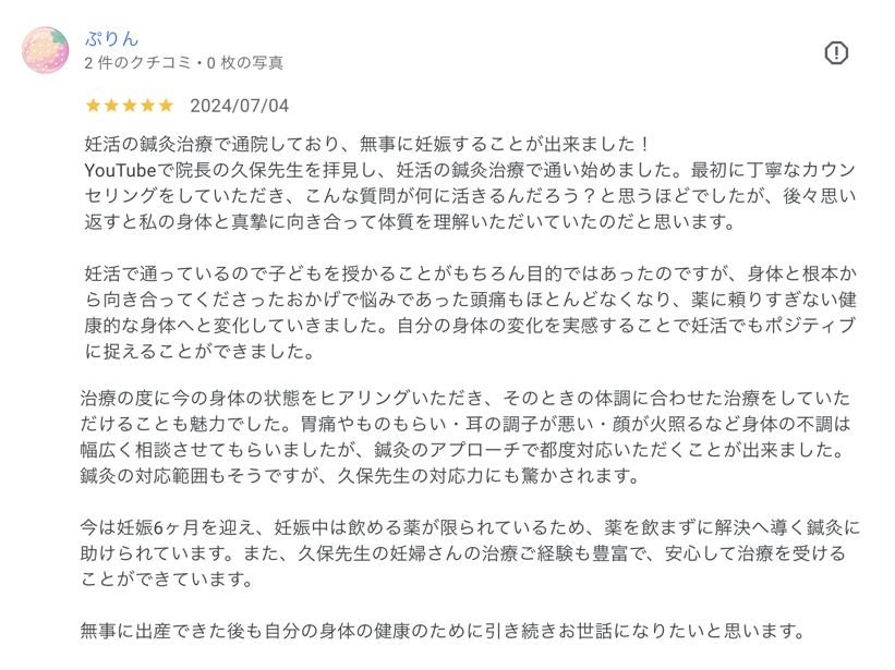 YouTubeで院長の久保先生を拝見し、妊活の鍼灸治療で通い始めました。