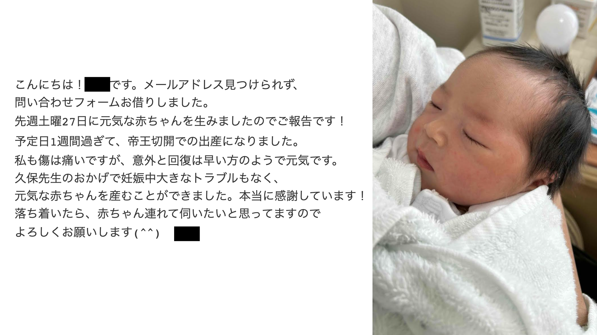 久保先生のおかげで妊娠中大きなトラブルもなく、元気な赤ちゃんを産むことができました。本当に感謝しています!