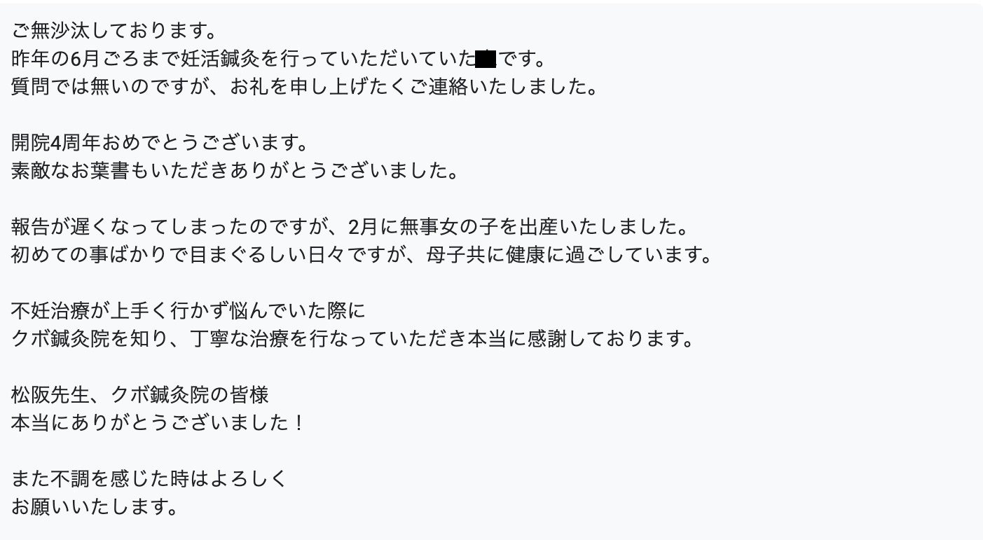 ご無沙汰しております。 昨年の6月ごろまで妊活鍼灸を行っていただいていたMです。 質問では無いのですが、お礼を申し上げたくご連絡いたしました。