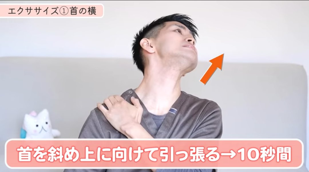 首の斜め前あたりがじわっと伸びていればOKです。胸鎖乳突筋と斜角筋の両方にアプローチできます。20秒間キープ。反対側も同様に行います。