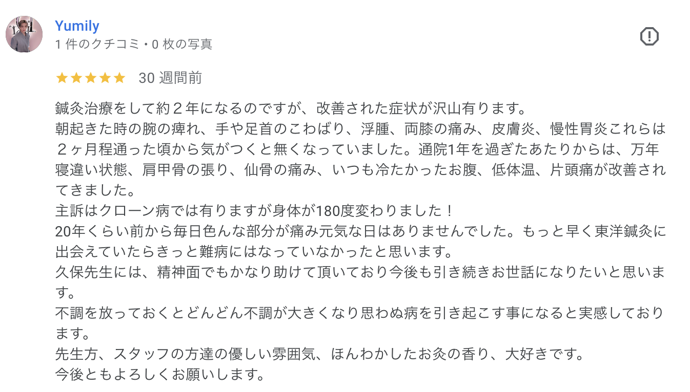 20年くらい前から毎日色んな部分が痛み元気な日はありませんでした。もっと早く東洋鍼灸に出会えていたらきっと難病にはなっていなかったと思います。