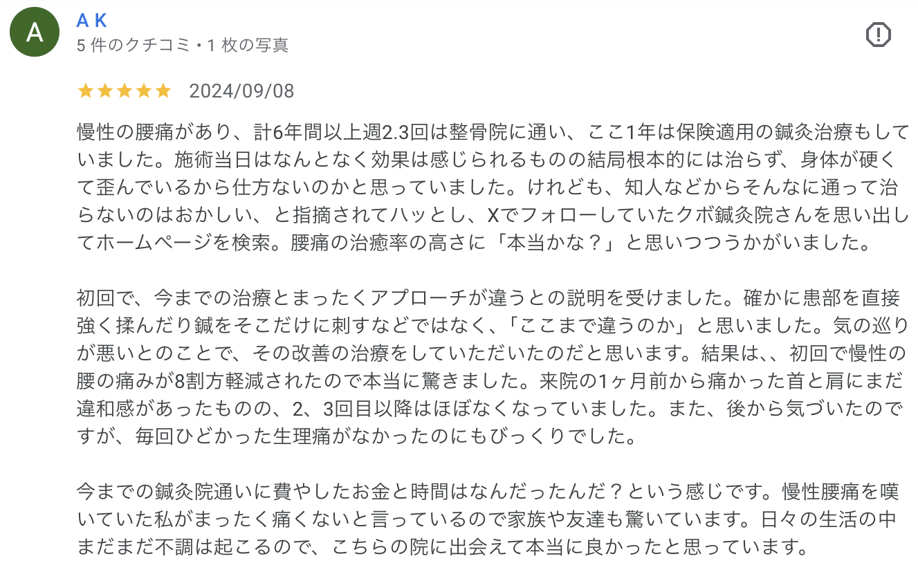 を組み合わせた施術をおこない、Google口コミ100件以上、SNSフォロワー16万人と、遠方から来院される方も多いです。