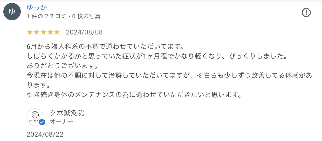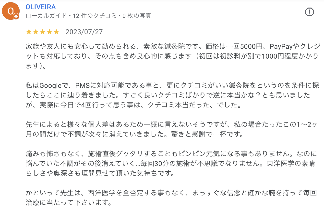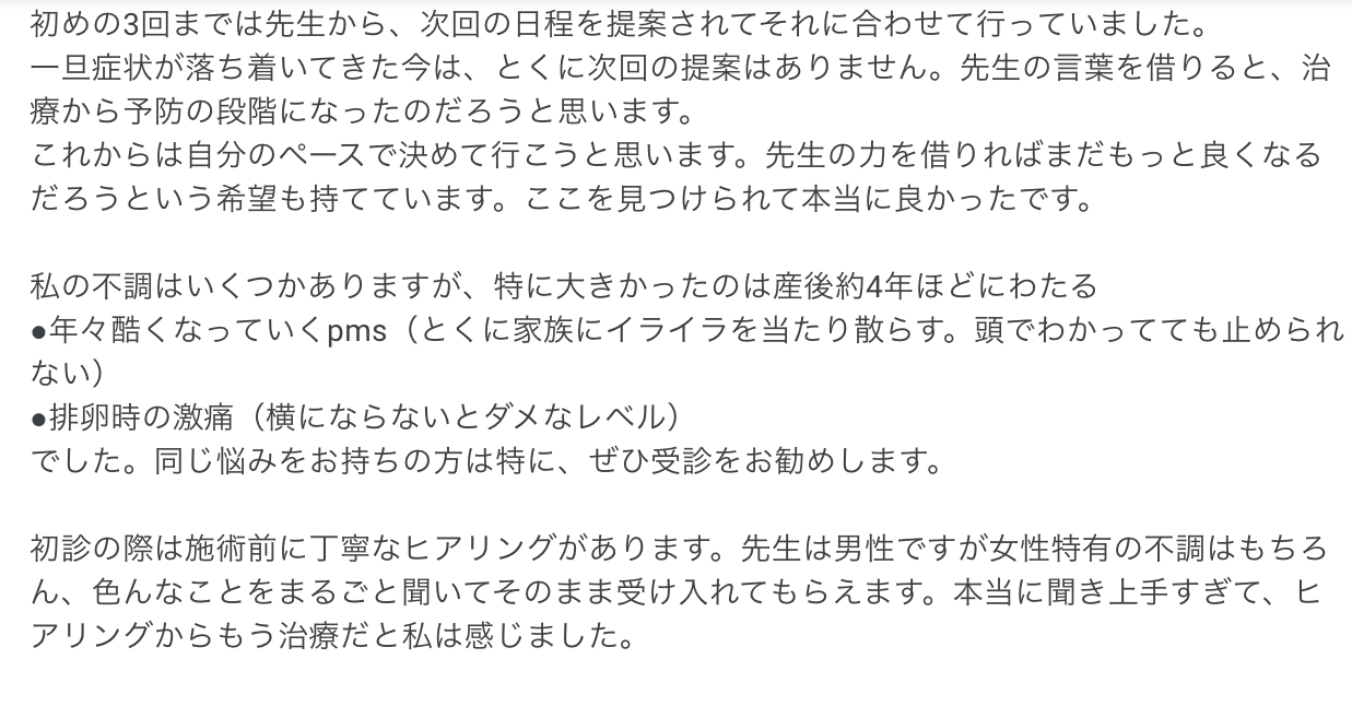 私はGoogleで、PMSに対応可能である事と、更にクチコミがいい鍼灸院をというのを条件に探したらここに辿り着きました。すごく良いクチコミばかりで逆に本当かな?とも思いましたが、実際に今日で4回行って思う事は、クチコミ本当だった、でした。