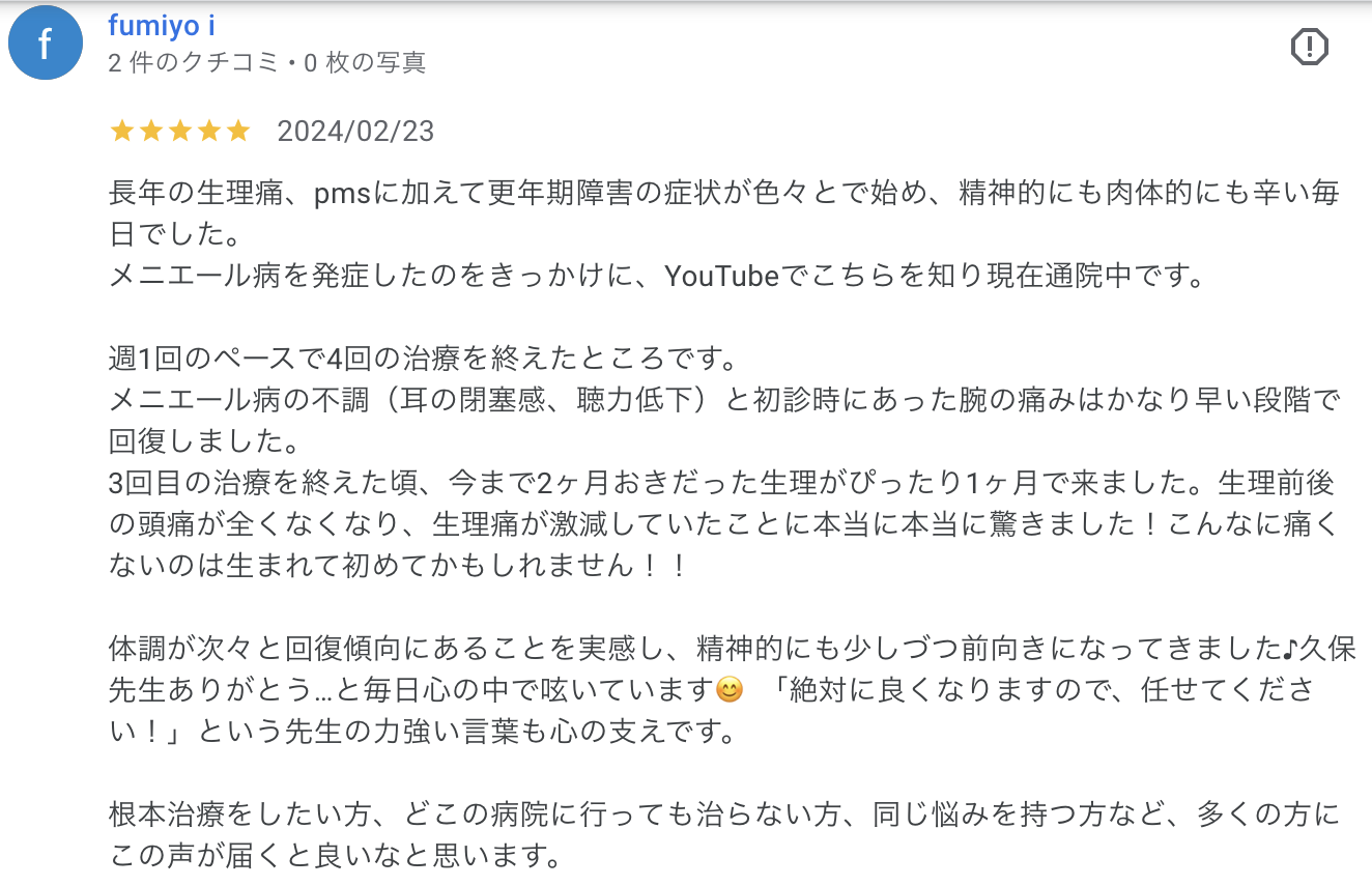 今現在は他の不調に対して治療していただいてますが、そちらも少しずつ改善してる体感があります。