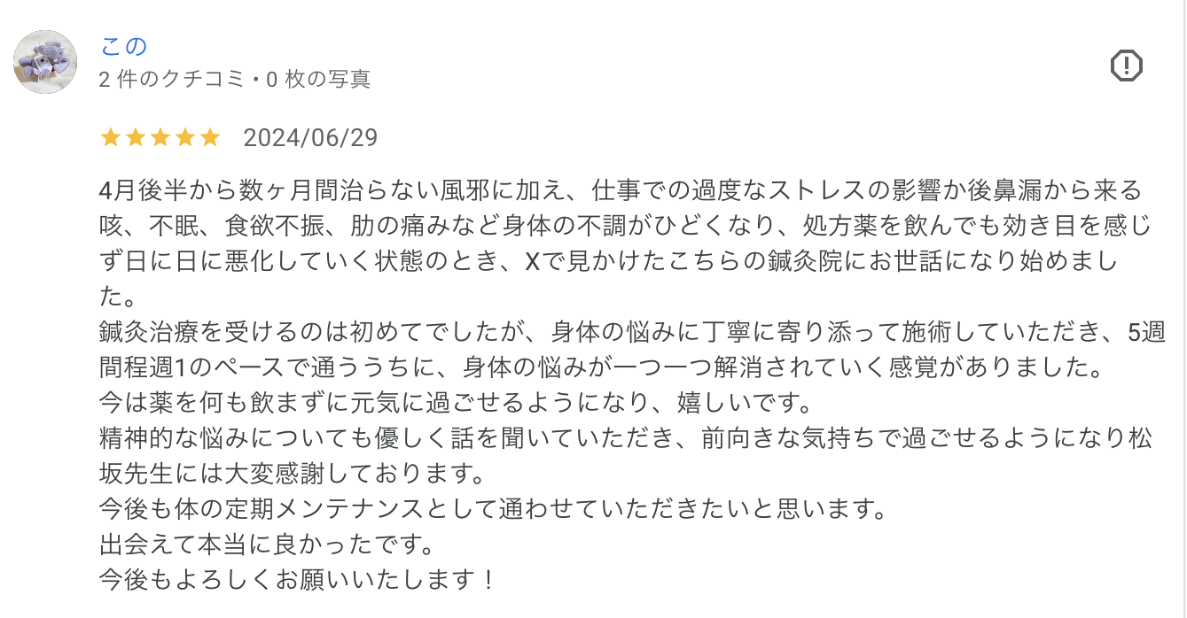 4月後半から数ヶ月間治らない風邪に加え、仕事での過度なストレスの影響か後鼻漏から来る咳、不眠、食欲不振、肋の痛みなど身体の不調がひどくなり、処方薬を飲んでも効き目を感じず日に日に悪化していく状態のとき、Xで見かけたこちらの鍼灸院にお世話になり始めました。