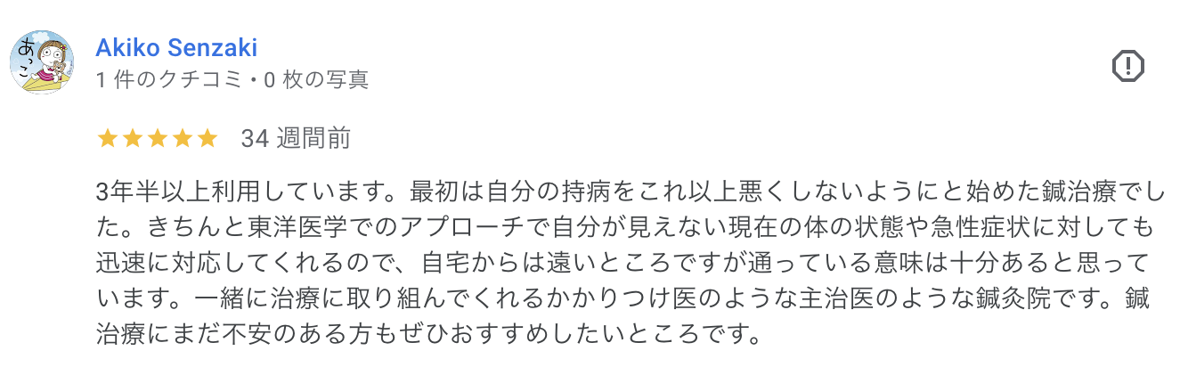 きちんと東洋医学でのアプローチで自分が見えない現在の体の状態や急性症状に対しても迅速に対応してくれるので、自宅からは遠いところですが通っている意味は十分あると思っています。