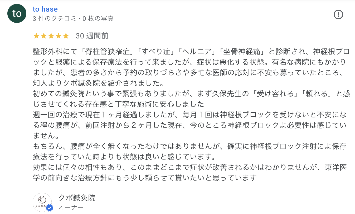 初めての鍼灸院という事で緊張もありましたが、まず久保先生の「受け容れる」「頼れる」と感じさせてくれる存在感と丁寧な施術に安心しました。