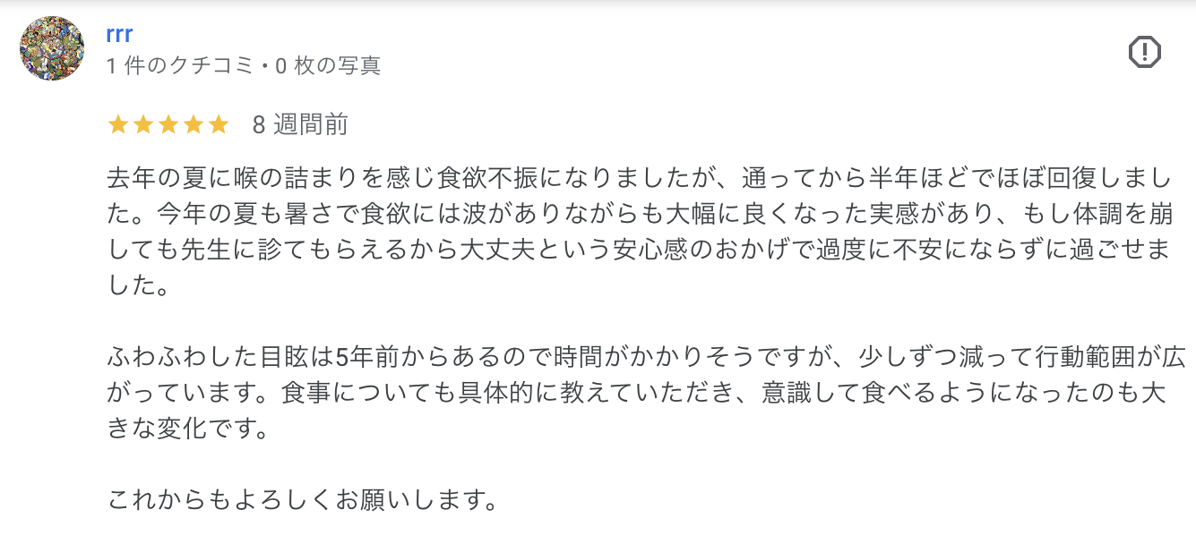 去年の夏に喉の詰まりを感じ食欲不振になりましたが、通ってから半年ほどでほぼ回復しました。