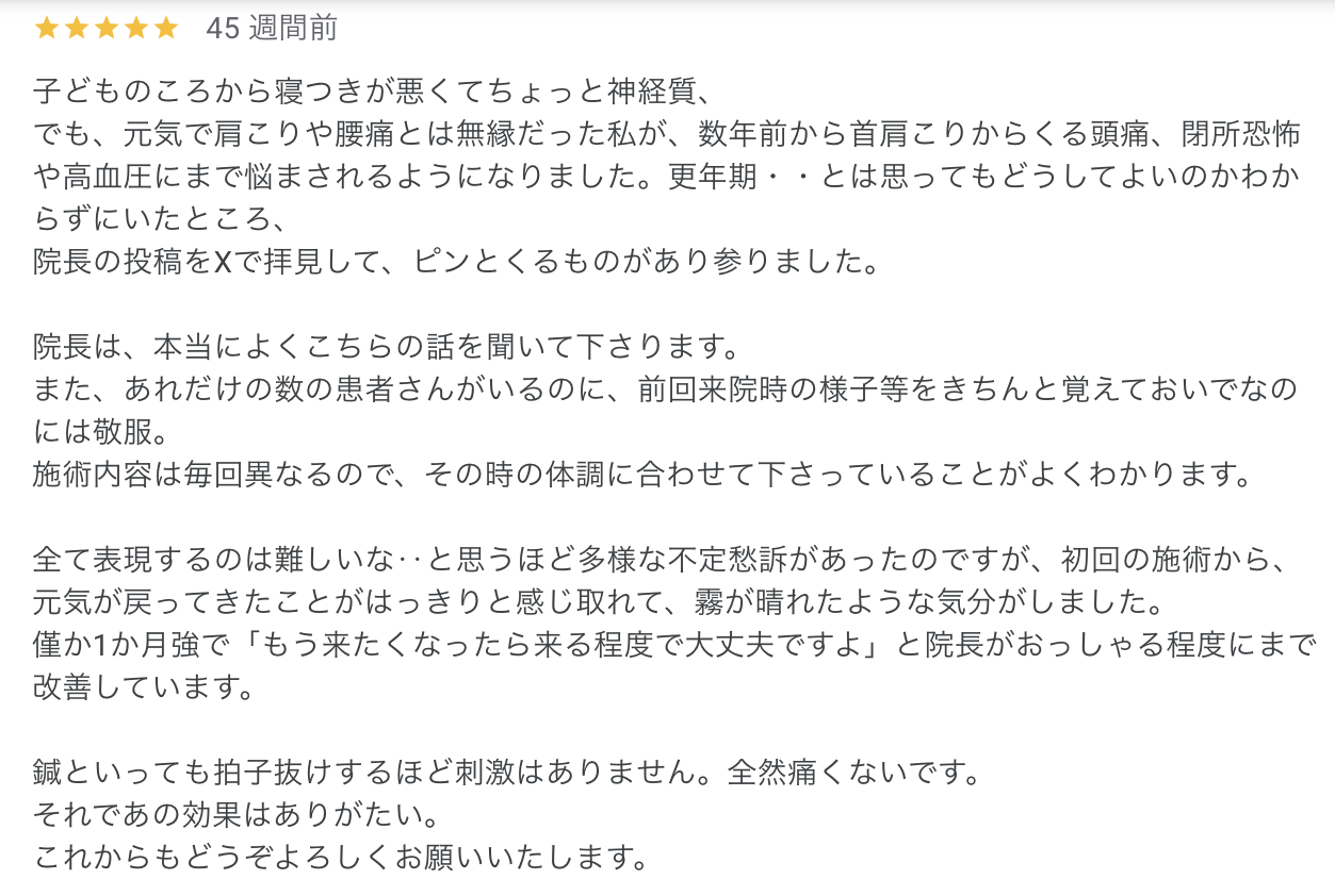 全て表現するのは難しいな‥と思うほど多様な不定愁訴があったのですが、初回の施術から、元気が戻ってきたことがはっきりと感じ取れて、霧が晴れたような気分がしました。