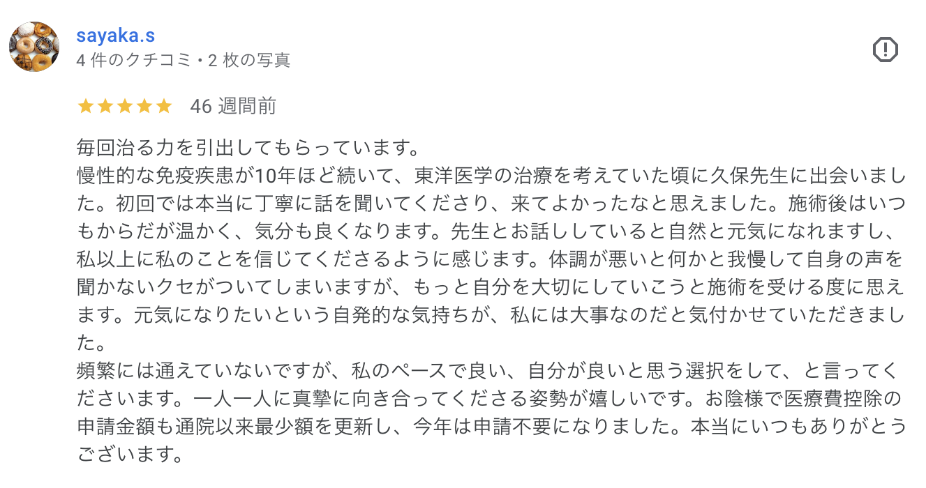 慢性的な免疫疾患が10年ほど続いて、東洋医学の治療を考えていた頃に久保先生に出会いました。初回では本当に丁寧に話を聞いてくださり、来てよかったなと思えました。