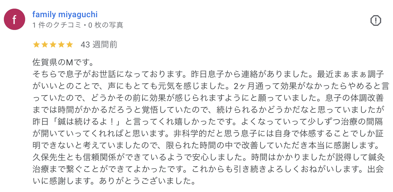 非科学的だと思う息子には自身で体感することでしか証明できないと考えていましたので、限られた時間の中で改善していただき本当に感謝します。