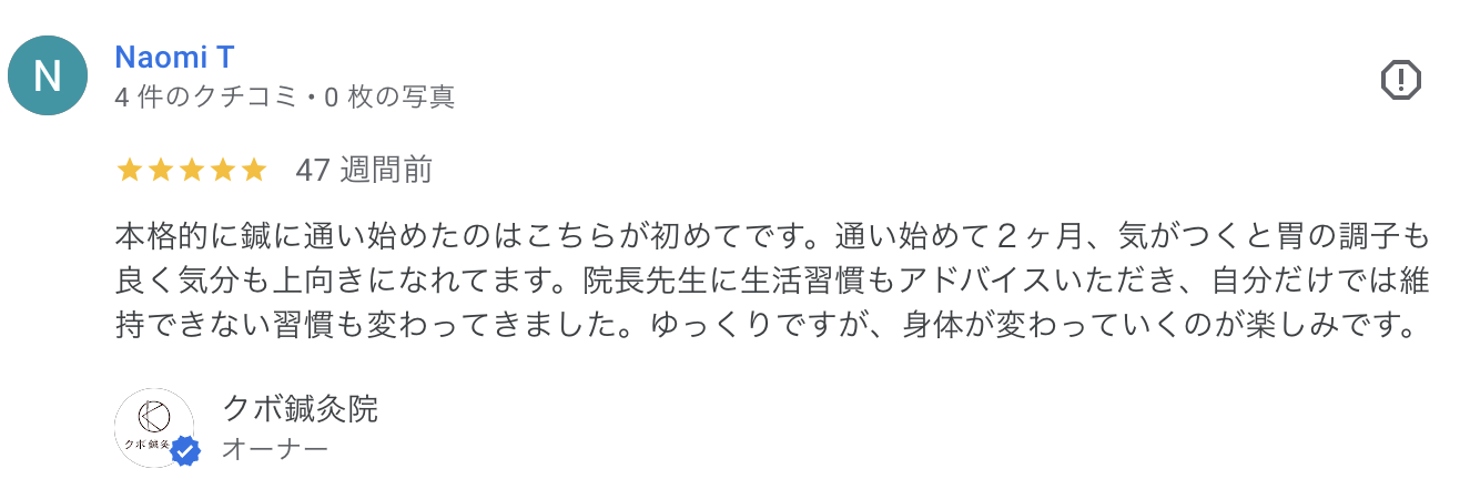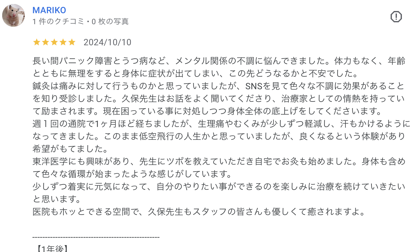 鍼灸は痛みに対して行うものかと思っていましたが、SNSを見て色々な不調に効果があることを知り受診しました。久保先生はお話をよく聞いてくださり、治療家としての情熱を持っていて励まされます。現在困っている事に対処しつつ身体全体の底上げをしてくださいます。