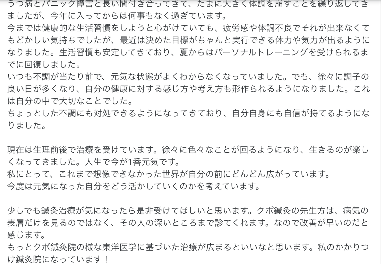 少しでも鍼灸治療が気になったら是非受けてほしいと思います。クボ鍼灸の先生方は、病気の表層だけを見るのではなく、その人の深いところまで診てくれます。なので改善が早いのだと感じます。