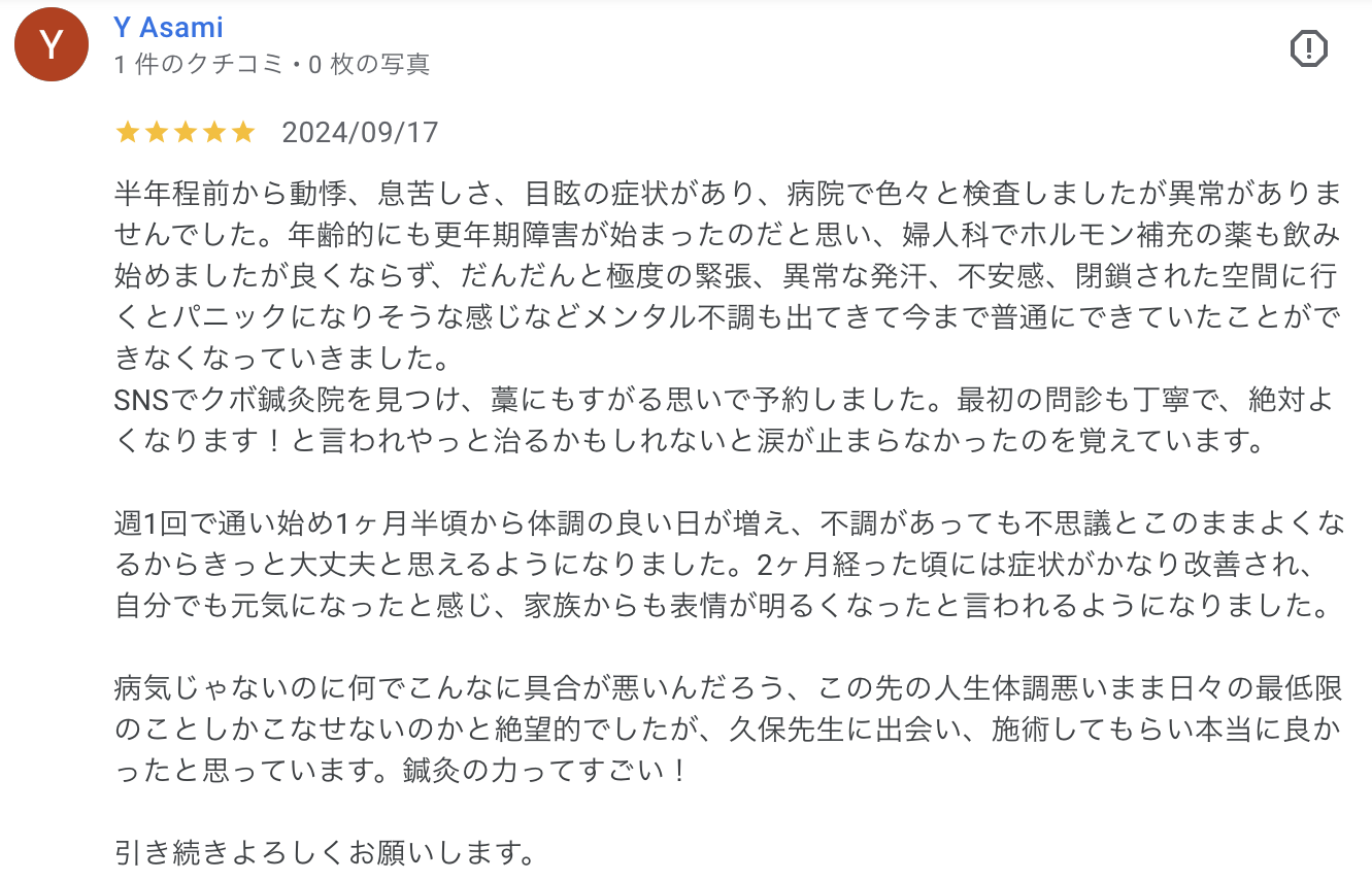 病気じゃないのに何でこんなに具合が悪いんだろう、この先の人生体調悪いまま日々の最低限のことしかこなせないのかと絶望的でしたが、久保先生に出会い、施術してもらい本当に良かったと思っています。鍼灸の力ってすごい!