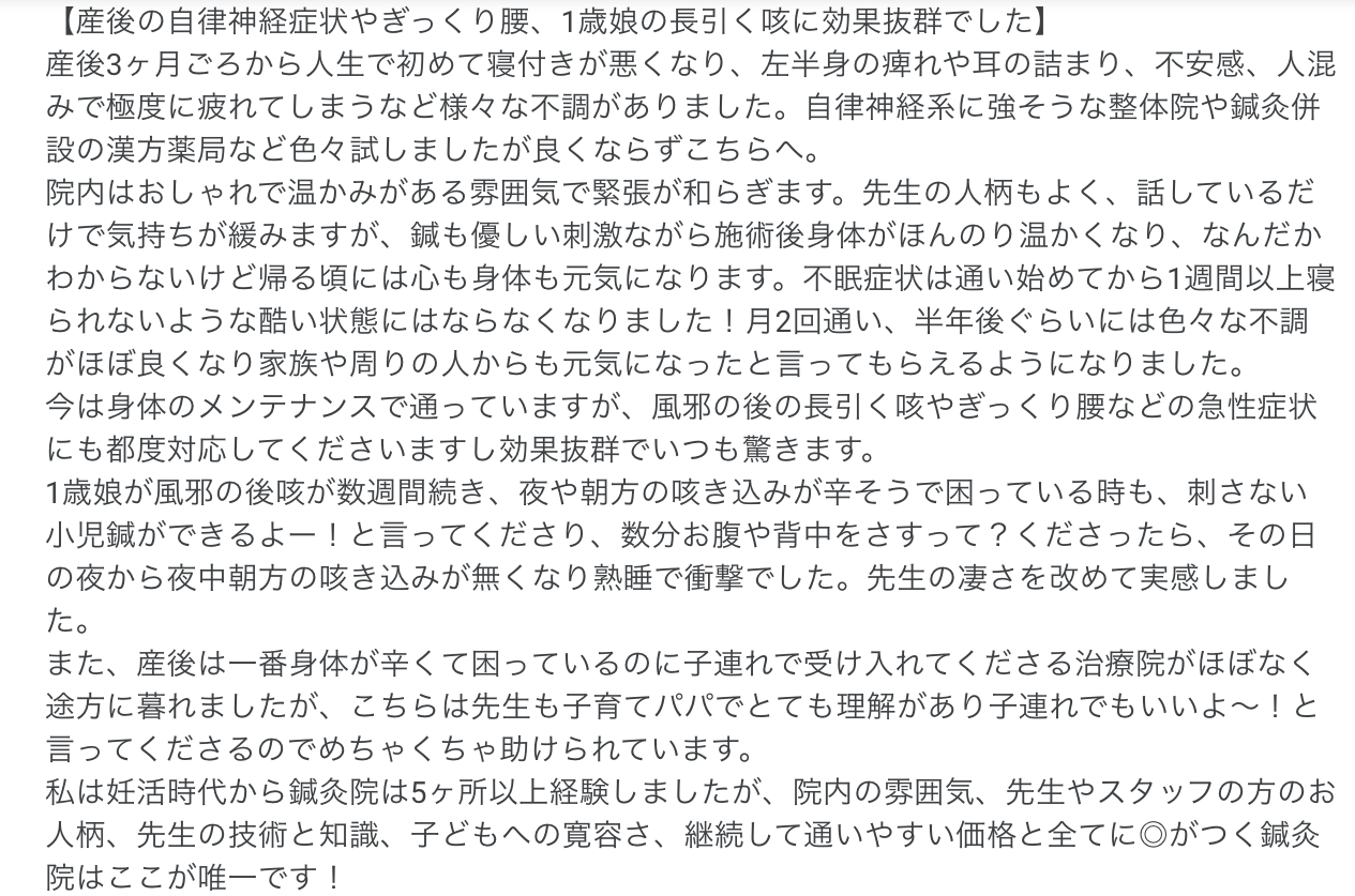 また、産後は一番身体が辛くて困っているのに子連れで受け入れてくださる治療院がほぼなく途方に暮れましたが、こちらは先生も子育てパパでとても理解があり子連れでもいいよ〜!と言ってくださるのでめちゃくちゃ助けられています。