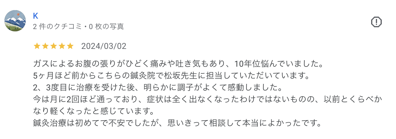 ガスによるお腹の張りがひどく痛みや吐き気もあり、10年位悩んでいました。