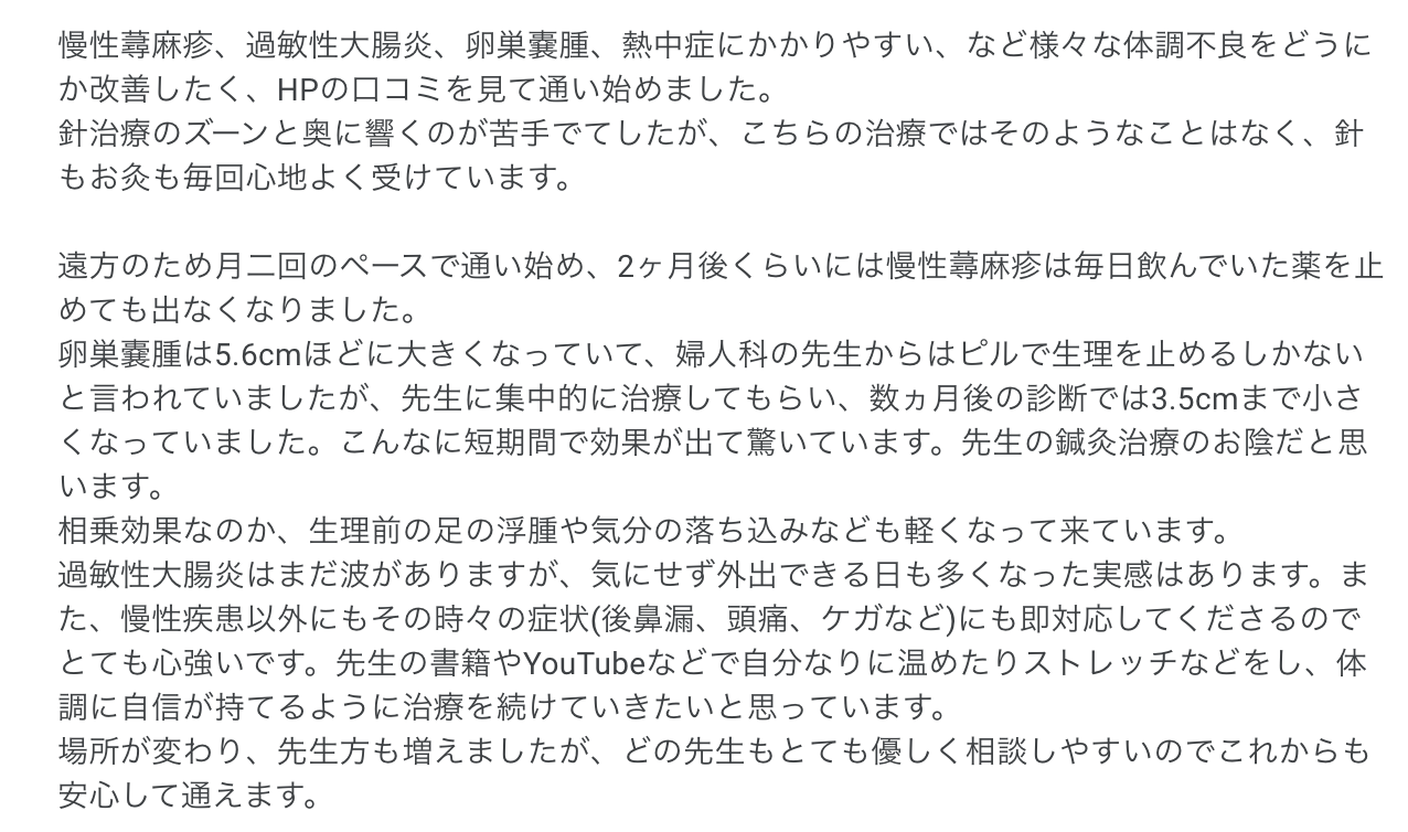 慢性蕁麻疹、過敏性大腸炎、卵巣嚢腫、熱中症にかかりやすい、など様々な体調不良をどうにか改善したく、HPの口コミを見て通い始めました。