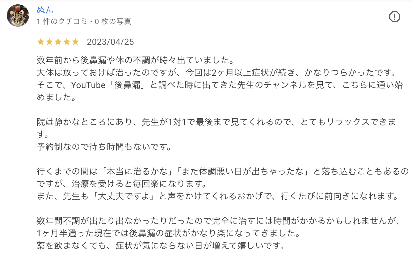 そこで、YouTube「後鼻漏」と調べた時に出てきた先生のチャンネルを見て、こちらに通い始めました。