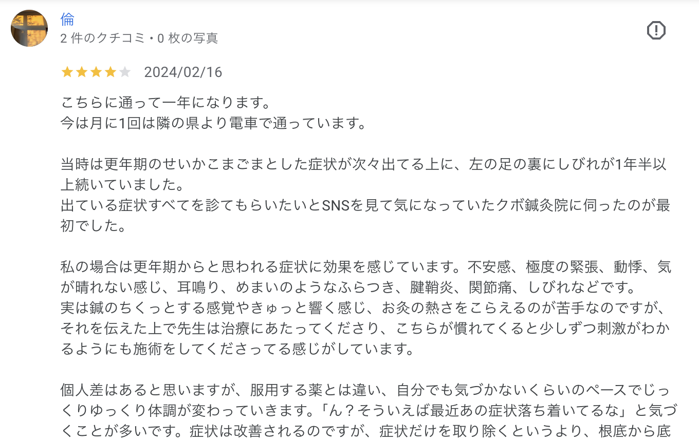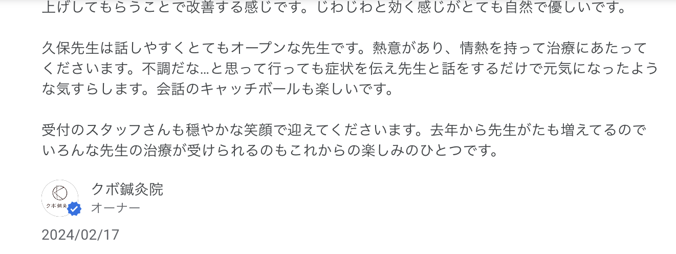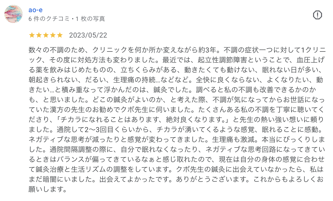 治療以外にも、体を良くする過程でずっと自分の中で邪魔をしていた考え方を変えてくれるアドバイスをいただけたり心身ともに健康になれたのは本当にクボ鍼灸院のおかげです。