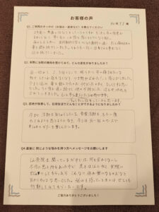 鍼灸院は聞いているだけでは何もわからないし、 不信に思うところもあったけど足を運んでみて実際に施術してもら ったらこんなに体が楽になるのだなと目から鱗な思いでした。